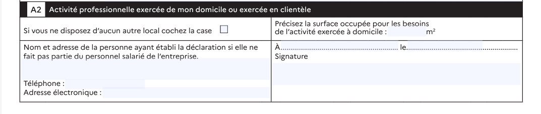 Cadre A2 - Activité professionnelle exercée de votre domicile ou exercée en clientèle